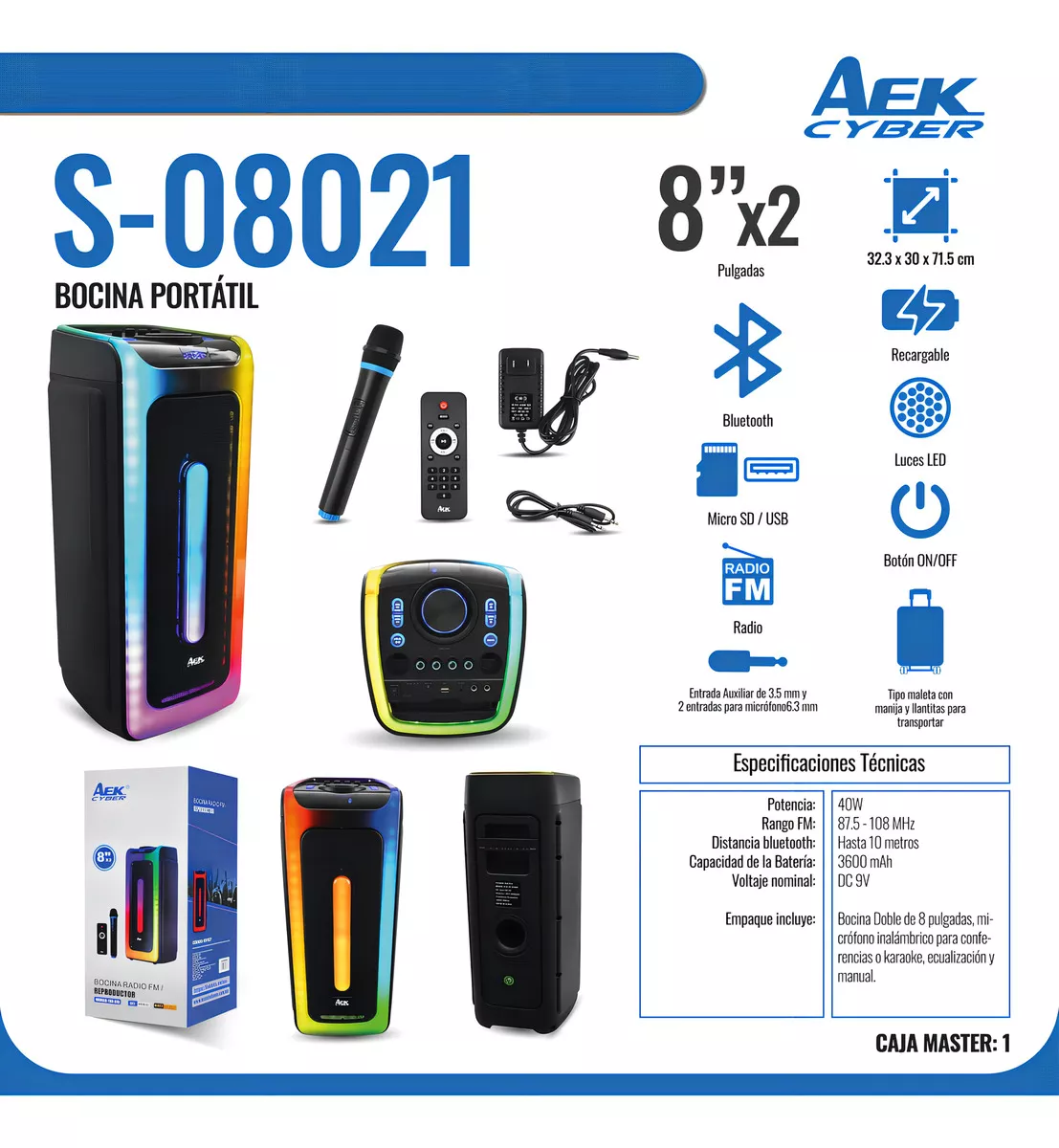 | Bocina Bluetooth | 8″ | Aek Cyber |