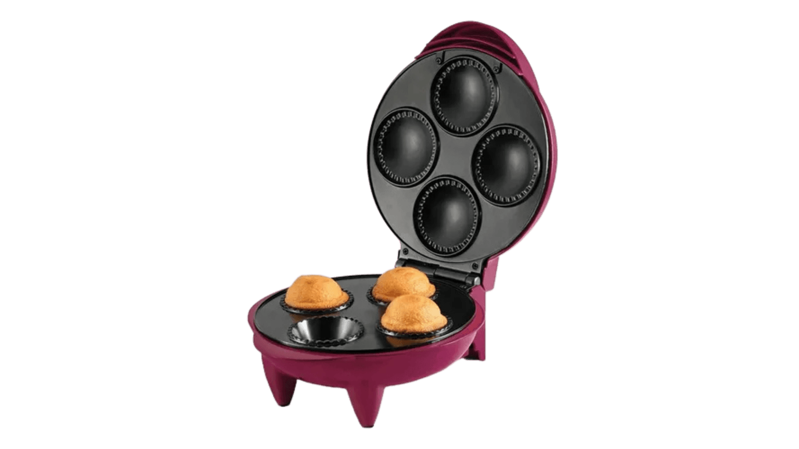 Máquina para preparar hasta 4 cupcakes de forma rápida y sencilla, con potencia de 1200 W y superficie antiadherente.