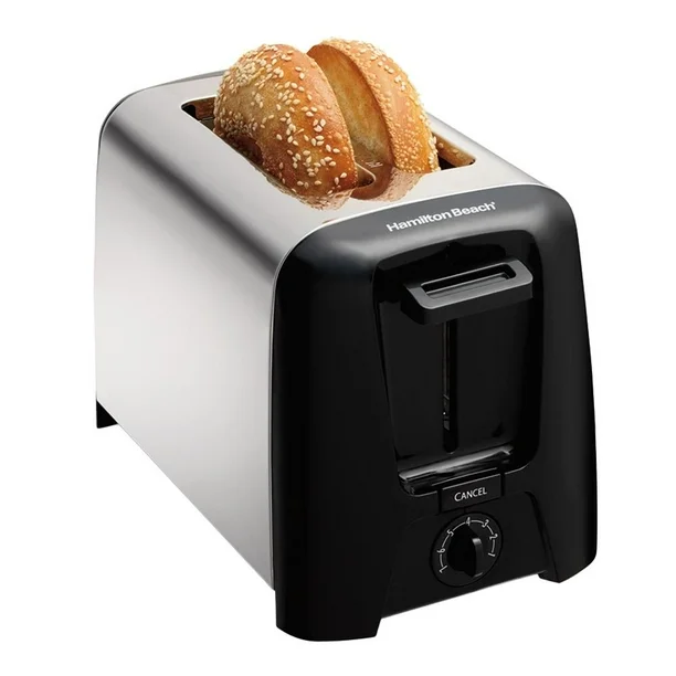Tostador Hamilton Beach de 2 rebanadas con expulsor automático, selector de dorado y bandeja para migajas para una limpieza sencilla.